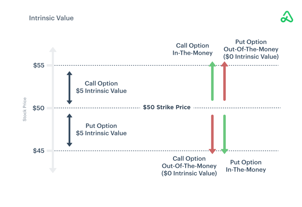 - Intrinsic value is the difference between the underlying asset’s current price and the option’s strike price. For example, if a stock is trading at $100 and you own a call option with a strike price of $90, the intrinsic value is $10.